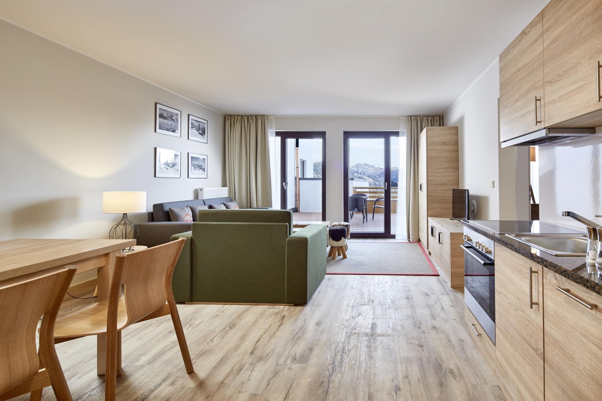 דירות סטודיו לזוגות – בעיצוב חמים עם ריהוט עץ טבעי, אזור ישיבה נעים, מטבחון מאובזר, מרפסת ונוף הרים מרגיע.